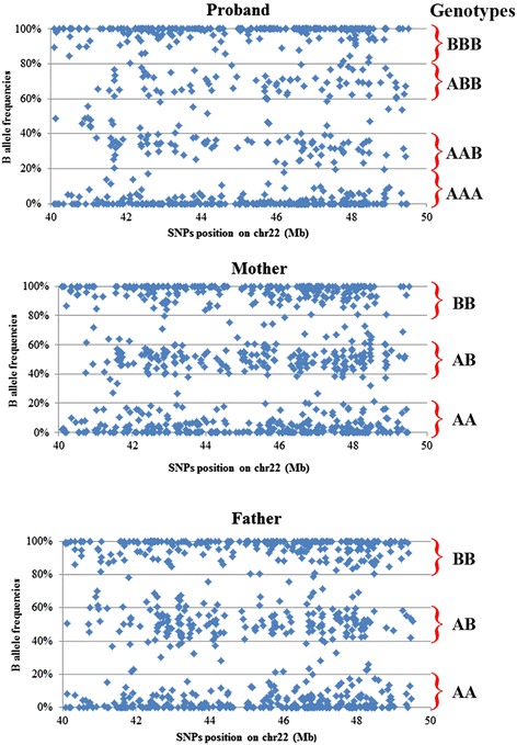Case presentation: We report the case of a 15-year-old dysmorphic girl with low grade psychomotor retardation characterized by a karyotype with a large acrocentric short arm of one chromosome 22. Cytogenetic analysis revealed a normal karyotype with a very intense Q-fluorescent and large satellite on the chromosome 22 short arm. Fluorescence in situ hybridisation analysis showed a de novo partial trisomy of the 22q13.2-qter chromosome region attached to the short arm of chromosome 22. SNP-array analysis showed that the duplication was 8.5 Mb long and originated from the paternal chromosome. Haplotype analysis revealed that the two paternal copies of the distal part of chromosome 22 have the same haplotype and, therefore, both originated from the same paternal chromosome 22. A possible molecular mechanism that could explain this scenario is a break-induced replication (BIR) which is involved in non-reciprocal translocation events.