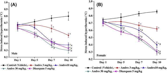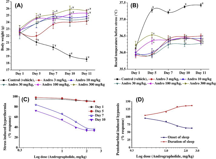 Andrographolide is a major bioactive secondary plant metabolite isolated Andrographis paniculata (Burm. F.) Wall. Ex. Nees. ( chuān xīn lián), a well-known traditionally used medicinal herb. The aim of the study was to pharmacologically evaluate the beneficial effect of andrographolide on stress-induced thermoregulatory and other physiological responses in mice. A stress-induced hyperthermia test was conducted in mice. The test agents were orally administered once daily for 11 consecutive days, and treatment effects on body weight changes, basal rectal temperature, and foot-shock-triggered hyperthermic responses were quantified on Day 1, Day 5, Day 7, and Day 10 of the experiments. Pentobarbital-induced hypnosis was quantified on the 11(th) day of treatment. Observations made during a pilot dose finding experiment revealed that, like A. paniculata extracts, pure andrographolide also possess adaptogenic properties. Observed dose-dependent efficacies of 3 mg/kg/d, 10 mg/kg/d, and 30 mg/kg/d andrographolide in the pilot experiment were reconfirmed by conducting two further analogous experiments using separate groups of either male or female mice. In these confirmatory experiments, efficacies of andrographolide were compared with that of 5 mg/kg/d oral doses of the standard anxiolytic diazepam. Significantly reduced body weights and elevated core temperatures of the three vehicle-treated control groups observed on the 5(th) day and subsequent observational days were completely absent even in the groups treated with the lowest andrographolide dose (3 mg/kg/d) or diazepam (5 mg/kg/d). Benzodiazepine-like potentiation of pentobarbital hypnosis was observed in andrographolide-treated animals. These observations reveal that andrographolide is functionally a diazepam-like desensitizer of biological mechanisms, and processes involved in stress trigger thermoregulatory and other physiological responses.