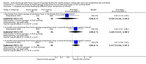 Early discharge with home support of gavage feeding for stable preterm infants who have not established full oral feeds.Cochrane Database Syst Rev. 2003;(4):CD003743. doi: 10.1002/14651858.CD003743. Cochrane Database Syst Rev. 2003. Update in: Cochrane Database Syst Rev. 2015 Jul 08;(7):CD003743. doi: 10.1002/14651858.CD003743.pub2. PMID: 14583991 Updated.