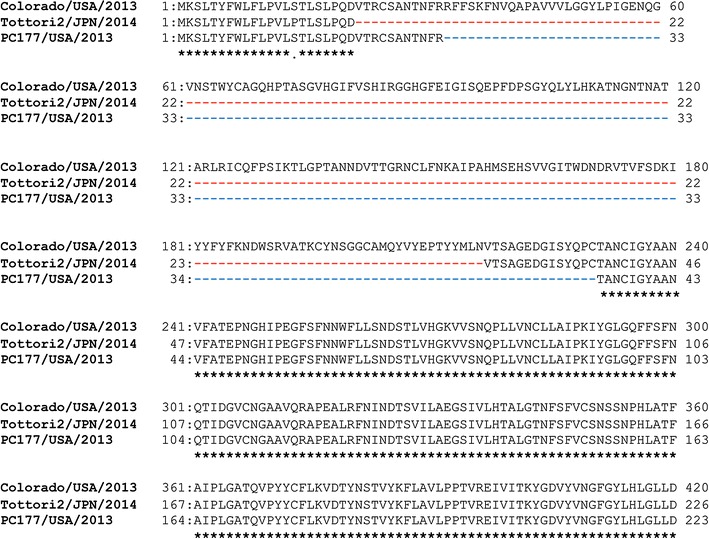 From October 2013 to date, approximately 1,000 outbreaks of porcine epidemic diarrhoea virus (PEDV) have occurred in Japan. Porcine epidemic diarrhoea with non-lethal effects in piglets was identified in Tottori prefecture in October 2014. Complete genome analysis revealed that the causative pathogen, Tottori2, is a new PEDV variant with a large (582 nt) deletion in the spike gene. Phylogenetic analysis indicated that the Tottori2 PEDV strain might have been derived from the current PEDV strains circulating in domestic pigs. Moreover, the Tottori2 PEDV strain was successfully isolated in Vero cells by serial passage.