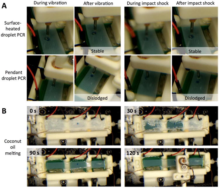 A novel polymerase chain reaction (PCR) device was developed that uses wire-guided droplet manipulation (WDM) to guide a droplet over three different heating chambers. After PCR amplification, end-point detection is achieved using a smartphone-based fluorescence microscope. The device was tested for identification of the 16S rRNA gene V3 hypervariable region from Escherichia coli genomic DNA. The lower limit of detection was 10(3) genome copies per sample. The device is portable with smartphone-based end-point detection and provides the assay results quickly (15 min for a 30-cycle amplification) and accurately. The system is also shock and vibration resistant, due to the multiple points of contact between the droplet and the thermocouple and the Teflon film on the heater surfaces. The thermocouple also provides real-time droplet temperature feedback to ensure it reaches the set temperature before moving to the next chamber/step in PCR. The device is equipped to use either silicone oil or coconut oil. Coconut oil provides additional portability and ease of transportation by eliminating spilling because its high melting temperature means it is solid at room temperature.