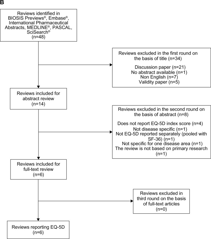 Methods: Two systematic literature searches were conducted according to the Preferred Reporting Items for Systematic reviews and Meta-Analyses (PRISMA) guidelines. Searches were conducted in ten databases including Embase, MEDLINE, and the Cochrane Central Register of Controlled Trials (CENTRAL). The first search (December 2013) used search terms psoria* AND (EQ5D OR EQ OR EUROQoL). Only publications of original research, which reported baseline EQ-5D scores for mild/moderate/severe psoriasis, were included. The second search (March 2014) used the terms (systematic review) AND (EQ5D OR EQ 5D OR EuroQoL). Titles were screened by two independent reviewers. Four independent reviewers reviewed titles and full-length papers. EQ-5D scores for psoriasis patients were qualitatively compared with scores from patients with other chronic diseases identified through the literature search.