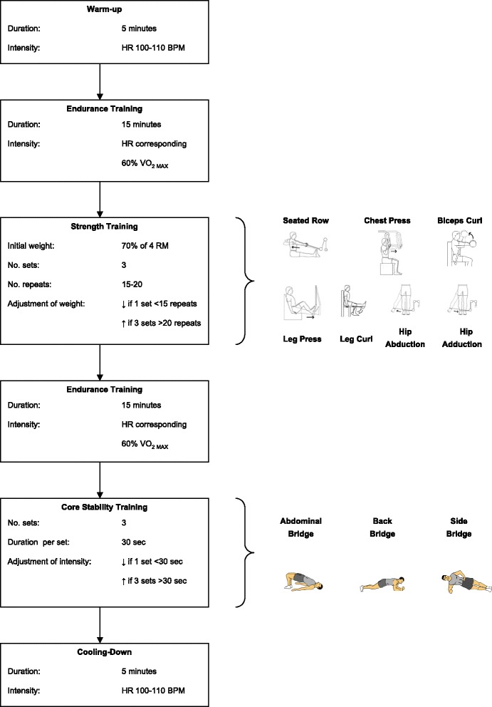 Methods: Training comprised 36 sessions of standardized aerobic, resistance and core stability exercises over 12 weeks. Before and after, the primary outcome measures safety, endurance (aerobic exercise capacity and distance walked on the 6 min walk test) and muscle strength, and secondary outcome measures core stability, muscle function and body composition, were evaluated.