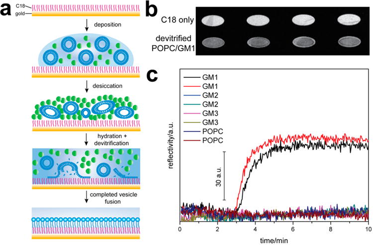The fabrication of large-scale, solid-supported lipid bilayer (SLB) arrays has traditionally been an arduous and complex task, primarily due to the need to maintain SLBs within an aqueous environment. In this work, we demonstrate the use of trehalose vitrified phospholipid vesicles that facilitate on-demand generation of microarrays, allowing each element a unique composition, for the label-free and high-throughput analysis of biomolecular interactions by SPR imaging (SPRi). Small, unilamellar vesicles (SUVs) are suspended in trehalose, deposited in a spatially defined manner, with the trehalose vitrifying on either hydrophilic or hydrophobic SPR substrates. SLBs are subsequently spontaneously formed on-demand simply by in situ hydration of the array in the SPR instrument flow cell. The resulting SLBs exhibit high lateral mobility, characteristic of fluidic cellular lipid membranes, and preserve the biological function of embedded cell membrane receptors, as indicated by SPR affinity measurements. Independent fluorescence and SPR imaging studies show that the individual SLBs stay localized at the area of deposition, without any encapsulating matrix, confining coral, or boundaries. The introduced methodology allows individually addressable SLB arrays to be analyzed with excellent label-free sensitivity in a real-time, high-throughput manner. Various protein-ganglioside interactions have been selected as a model system to illustrate discrimination of strong and weak binding responses in SPRi sensorgrams. This methodology has been applied toward generating hybrid bilayer membranes on hydrophobic SPR substrates, demonstrating its versatility toward a range of surfaces and membrane geometries. The stability of the fabricated arrays, over medium to long storage periods, was evaluated and found to be good. The highly efficient and easily scalable nature of the method has the potential to be applied to a variety of label-free sensing platforms requiring lipid membranes for high-throughput analysis of their properties and constituents.
