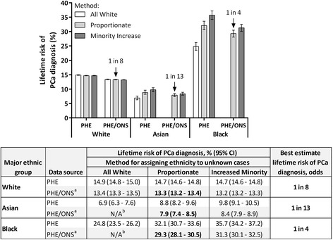Methods: Public Health England provided prostate cancer incidence and mortality data for England (2008-2010) by major ethnic group. Ethnicity and mortality data were incomplete, requiring various assumptions and adjustments before lifetime risk was calculated using DevCan (percent, range).
