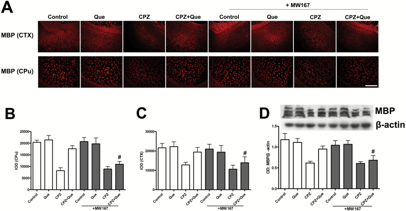 Results: Quetiapine ameliorated the schizophrenia-like behaviors and decreased expression of myelin basic protein and inhibition of Notch signaling molecules, such as Notch1, Hes1, and Hes5, in the forebrain that induced by cuprizone. These beneficial effects of quetiapine were abolished by MW167.