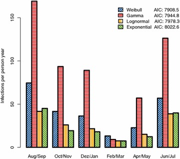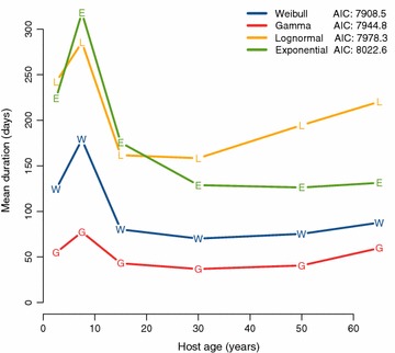 Methods: Data on the presence of P. falciparum msp2 genotypes in six blood samples collected over one year was analysed, together with four samples collected over 1 week, from a cohort in Navrongo (Ghana). Mathematical models assuming either exponential, Weibull, gamma, or log-normal infection durations were estimated separately for six age-groups. The method allowed for varying clonal acquisition and detection rates.