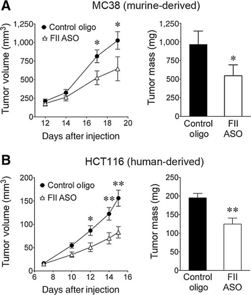 Thrombin-mediated proteolysis is a major determinant of metastasis, but is not universally important for primary tumor growth. Here, we report that colorectal adenocarcinoma represents one important exception whereby thrombin-mediated functions support both primary tumor growth and metastasis. In contrast with studies of multiple nongastrointestinal cancers, we found that the growth of primary tumors formed by murine and human colon cancer cells was reduced in mice by genetic or pharmacologic reduction of circulating prothrombin. Reduced prothrombin expression was associated with lower mitotic indices and invasion of surrounding tissue. Mechanistic investigations revealed that thrombin-driven colonic adenocarcinoma growth relied upon at least two targets of thrombin-mediated proteolysis, protease-activated receptor-1 (PAR-1) expressed by stromal cells and the extracellular matrix protein, fibrinogen. Colonic adenocarcinoma growth was reduced in PAR-1-deficient mice, implicating stromal cell-associated PAR-1 as one thrombin target important for tumor outgrowth. Furthermore, tumor growth was dramatically impeded in fibrinogen-deficient mice, offering the first direct evidence of a critical functional role for fibrinogen in malignant tumor growth. Tumors harvested from fibrinogen-deficient mice displayed a relative reduction in cell proliferative indices, as well as increased tumor necrosis and decreased tumor vascular density. Collectively, our findings established a functional role for thrombin and its targets PAR-1 and fibrinogen in the pathogenesis of colonic adenocarcinoma, supporting tumor growth as well as local invasion and metastasis.