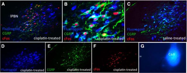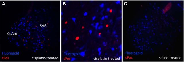 Cisplatin chemotherapy is used commonly to treat a variety of cancers despite severe side effects such as nausea, vomiting, and anorexia that compromise quality of life and limit treatment adherence. The neural mechanisms mediating these side effects remain elusive despite decades of clinical use. Recent data highlight the dorsal vagal complex (DVC), lateral parabrachial nucleus (lPBN), and central nucleus of the amygdala (CeA) as potential sites of action in mediating the side effects of cisplatin. Here, results from immunohistochemical studies in rats identified a population of cisplatin-activated DVC neurons that project to the lPBN and a population of cisplatin-activated lPBN calcitonin gene-related peptide (CGRP, a marker for glutamatergic neurons in the lPBN) neurons that project to the CeA, outlining a neuroanatomical circuit that is activated by cisplatin. CeA gene expressions of AMPA and NMDA glutamate receptor subunits were markedly increased after cisplatin treatment, suggesting that CeA glutamate receptor signaling plays a role in mediating cisplatin side effects. Consistent with gene expression results, behavioral/pharmacological data showed that CeA AMPA/kainate receptor blockade attenuates cisplatin-induced pica (a proxy for nausea/behavioral malaise in nonvomiting laboratory rodents) and that CeA NMDA receptor blockade attenuates cisplatin-induced anorexia and body weight loss in addition to pica, demonstrating that glutamate receptor signaling in the CeA is critical for the energy balance dysregulation caused by cisplatin treatment. Together, these data highlight a novel circuit and CGRP/glutamatergic mechanism through which cisplatin-induced malaise and energy balance dysregulation are mediated.