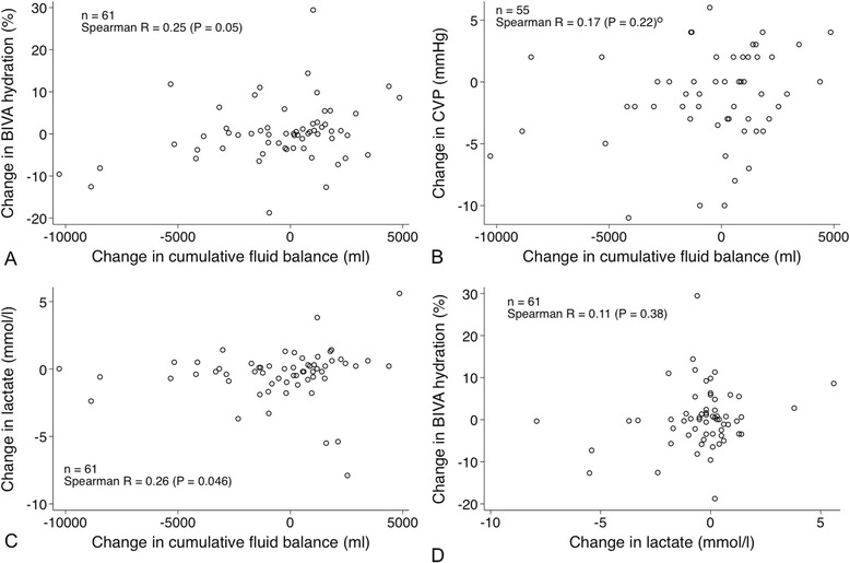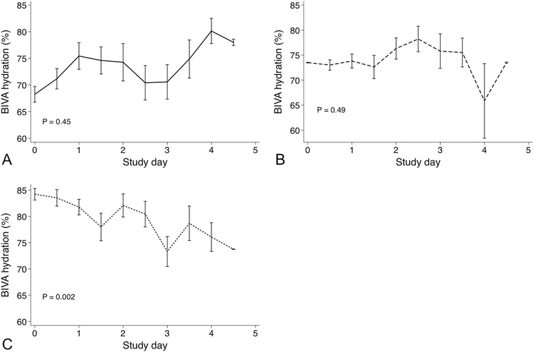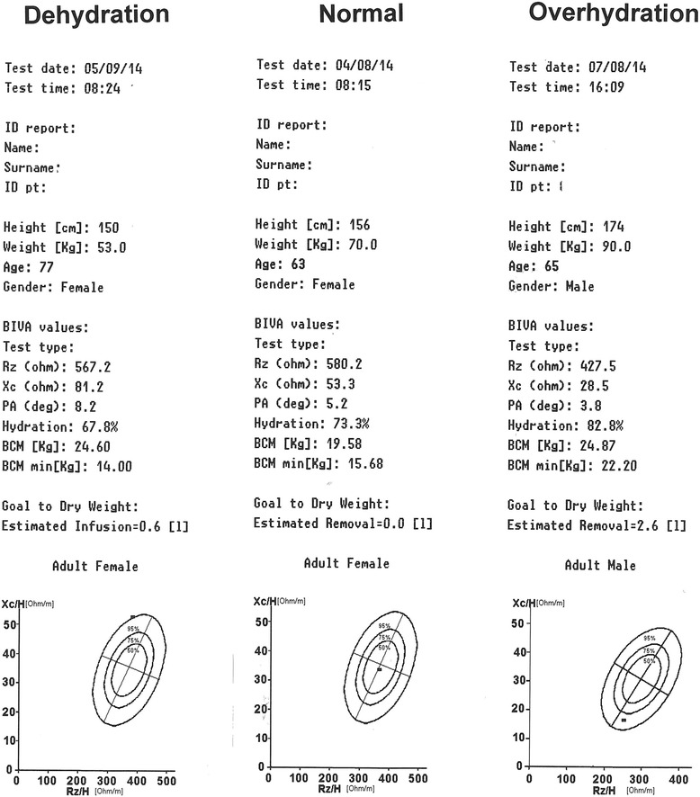 Results: We performed 344 BIVA measurements in 61 patients. According to BIVA, 14 patients (23%) were dehydrated, 22 (36%) were normally hydrated and 25 (41%) were overhydrated upon ICU admission. Patients with normal BIVA hydration were less sick, had fewer comorbidities and had less deranged physiology than patients found to be dehydrated or overhydrated with BIVA. Cumulative fluid balance increased in patients found to be dehydrated with BIVA by a mean of 3.4±2.2 L, whereas in patients found to be overhydrated with BIVA, it decreased by a mean of 4.5±6.9 L. In patients found to be normally hydrated with BIVA, fluid balance remained unchanged. BIVA-defined hydration increased with 1 L (median change 1.5%, P =0.09) or 2 L (median change 0.7%, P =0.09) of calculated fluid gains. BIVA-defined hydration decreased (median change -0.8%, P =0.02) with a negative cumulative fluid balance of >2 L. BIVA-defined hydration between first and last measurement correlated with the corresponding change in fluid balance (ρ =0.25, P =0.05).