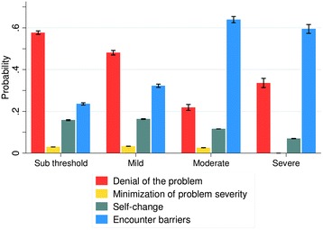 Results: Of 1,008 patients diagnosed with an alcohol use disorder (via general practitioner or patient interview) in the past 12 months, the majority (N = 810) did not receive treatment and 251 of those gave a reason for not seeking treatment. The most frequent reason was 'lack of problem awareness' (55.3% of those who responded), the second most common response was 'stigma or shame' (28.6%), followed by 'encounter barriers' (22.8%) and 'cope alone' (20.9%). The results indicated lower probabilities of reporting 'denial' and higher probabilities to report 'encounter barriers' as alcohol use disorders severity increases. However, both trends were discontinued for patients with severe alcohol use disorders.
