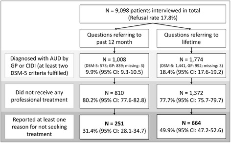 Conclusions: Particularly at lower levels of alcohol use disorder severity, a lack of problem awareness prevents patients from seeking treatment. Routinely alcohol consumption monitoring in primary care practices could help primary and secondary prevention of alcohol use disorders and increase treatment coverage.