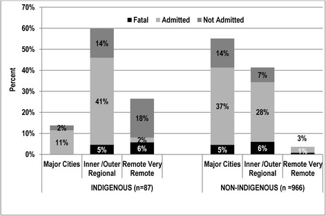 Results: There were 87 (6.7 % of all events) fatal and non-fatal (combined) Indigenous drowning events yielding a crude Incidence Rate of 16.8/100,000/annum. This is 44 % higher than the incidence rate for Non-Indigenous children. For every fatality, nine others were rescued and sought medical treatment (average 12 per year). There were no significant changes in Indigenous drowning incidents over the study period. Drowning rates were higher for Indigenous females than males. Overall incidence was higher among Indigenous children and adolescents than Non-Indigenous children for every calendar year and age-group (0-4 years; 5-9 years; 10-14 years) except those aged 15-19 years where no drowning events were recorded for males. Location of drowning sites was similar in both populations 0-19 years, however there were slight differences in frequency at each of the locations. The three leading drowning locations for Indigenous 0-19 years olds were pool (48 %), bath (21 %) and natural water (16 %), and for non-Indigenous 0-19 years the leading locations were pool (66 %), natural water (13 %) and bath (12 %) (p < .01). Except for pool drowning, Indigenous drowning occurred more often in geographic areas of relative disadvantage. Among Indigenous children drowning location varied with age (p < .001). Most frequent locations by age were: <1 year bath (71 %); 1-4 years pools (80 %); 5-9 years pools (75 %) and 10-19 years beach/ocean (36 %). Severity of event differed statistically with Indigenous status and by remoteness with all fatal drowning events occurring in Regional or Remote areas, and none in Major Cities.