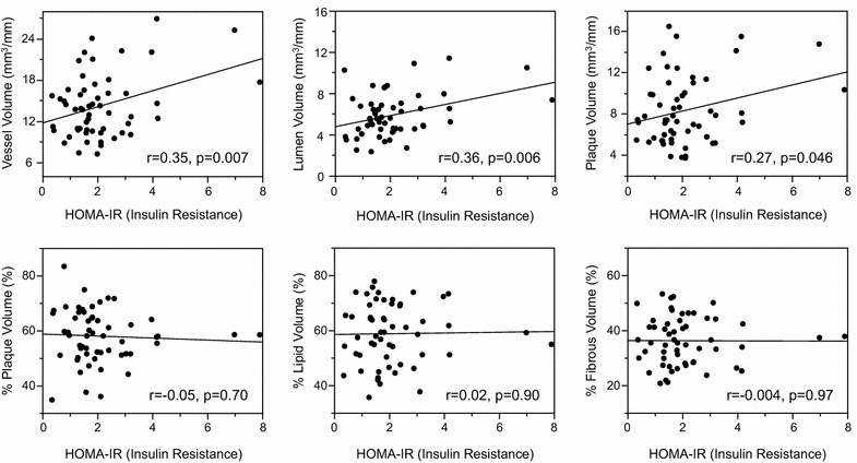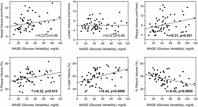 Results: Higher MAGE values were significantly correlated with larger percent plaque volumes (r = 0.32, p = 0.015), and increased lipid (r = 0.44, p = 0.0006) and decreased fibrous (r = -0.45, p = 0.0005) plaque components. In contrast, HbA1c or fasting plasma glucose values were not significantly correlated with plaque volumes and percent plaque components. Homeostasis model assessment of insulin resistance values were positively correlated with vessel (r = 0.35, p = 0.007) and plaque (r = 0.27, p = 0.046) volumes, but not with percent plaque components. In multiple regression analysis, higher MAGE values were independently associated with increased lipid (β = 0.80, p = 0.0035) and decreased fibrous (β = -0.79, p = 0.0034) contents in coronary plaques.