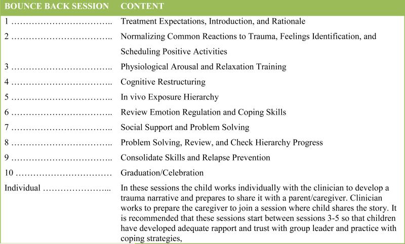 Results: Bounce Back was implemented with excellent clinician fidelity. Compared with children in the delayed condition, children who received Bounce Back immediately demonstrated significantly greater improvements in parent- and child-reported posttraumatic stress and child-reported anxiety symptoms over the 3-month intervention. Upon receipt of the intervention, the delayed intervention group demonstrated significant improvements in parent- and child-reported posttraumatic stress, depression, and anxiety symptoms. The immediate treatment group maintained or showed continued gains in all symptom domains over the 3-month follow-up period (6-month assessment).
