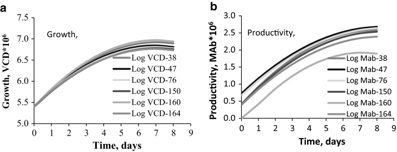The present study validates previously published methodologies-stochastic and Verhulst-for modelling the growth and MAb productivity of six CHO cell lines grown in batch cultures. Cytometric and biochemical data were used to model growth and productivity. The stochastic explanatory models were developed to improve our understanding of the underlying mechanisms of growth and productivity, whereas the Verhulst mechanistic models were developed for their predictability. The parameters of the two sets of models were compared for their biological significance. The stochastic models, based on the cytometric data, indicated that the productivity mechanism is cell specific. However, as shown before, the modelling results indicated that G2 + ER indicate high productivity, while G1 + ER indicate low productivity, where G1 and G2 are the cell cycle phases and ER is Endoplasmic Reticulum. In all cell lines, growth proved to be inversely proportional to the cumulative G1 time (CG1T) for the G1 phase, whereas productivity was directly proportional to ER. Verhulst's rule, "the lower the intrinsic growth factor (r), the higher the growth (K)," did not hold for growth across all cell lines but held good for the cell lines with the same growth mechanism-i.e., r is cell specific. However, the Verhulst productivity rule, that productivity is inversely proportional to the intrinsic productivity factor (r x ), held well across all cell lines in spite of differences in their mechanisms for productivity-that is, r x is not cell specific. The productivity profile, as described by Verhulst's logistic model, is very similar to the Michaelis-Menten enzyme kinetic equation, suggesting that productivity is more likely enzymatic in nature. Comparison of the stochastic and Verhulst models indicated that CG1T in the cytometric data has the same significance as r, the intrinsic growth factor in the Verhulst models. The stochastic explanatory and the Verhulst logistic models can explain the differences in the productivity of the six clones.