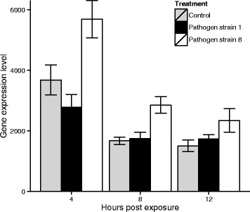 Background: Infection outcome in some coevolving host-pathogens is characterised by host-pathogen genetic interactions, where particular host genotypes are susceptible only to a subset of pathogen genotypes. To identify candidate genes responsible for the infection status of the host, we exposed a Daphnia magna host genotype to two bacterial strains of Pasteuria ramosa, one of which results in infection, while the other does not. At three time points (four, eight and 12 h) post pathogen exposure, we sequenced the complete transcriptome of the hosts using RNA-Seq (Illumina).