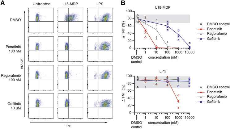 RIPK2 mediates pro-inflammatory signaling from the bacterial sensors NOD1 and NOD2, and is an emerging therapeutic target in autoimmune and inflammatory diseases. We observed that cellular RIPK2 can be potently inhibited by type II inhibitors that displace the kinase activation segment, whereas ATP-competitive type I inhibition was only poorly effective. The most potent RIPK2 inhibitors were the US Food and Drug Administration-approved drugs ponatinib and regorafenib. Their mechanism of action was independent of NOD2 interaction and involved loss of downstream kinase activation as evidenced by lack of RIPK2 autophosphorylation. Notably, these molecules also blocked RIPK2 ubiquitination and, consequently, inflammatory nuclear factor κB signaling. In monocytes, the inhibitors selectively blocked NOD-dependent tumor necrosis factor production without affecting lipopolysaccharide-dependent pathways. We also determined the first crystal structure of RIPK2 bound to ponatinib, and identified an allosteric site for inhibitor development. These results highlight the potential for type II inhibitors to treat indications of RIPK2 activation as well as inflammation-associated cancers.