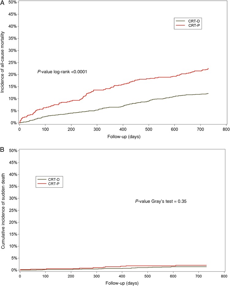 Conclusion: When compared with CRT-D patients, excess mortality in CRT-P recipients was mainly due to non-sudden death. Our findings suggest that CRT-P patients, as currently selected in routine clinical practice, would not potentially benefit with the addition of a defibrillator.