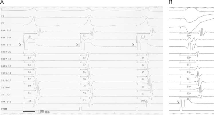 Methods: Our subjects were 9 patients undergoing electrophysiological studies before successful catheter ablation of a posteroseptal AP. During PHP, retrograde conduction occurred over an AP when the pacing stimulus to atrium (S-A) interval recorded near the AP remained unchanged whether the His bundle (HB) was captured or not (pattern 1), or when a loss of HB capture was associated with an increase in the S-A interval and no change in the V-A interval near the AP (pattern 2).
