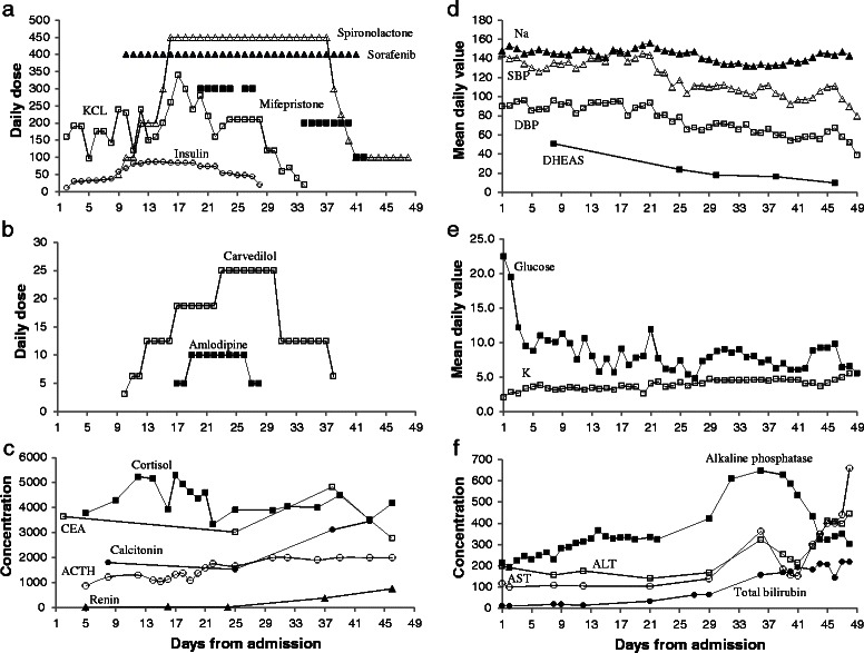 Conclusion: Extreme cortisol concentration may have contributed to aortic dissection and suppressed antidiuretic hormone secretion; which combined with hypokalemia due cortisol activation of mineralocorticoid receptors, manifested as diabetes insipidus. This is the first report of paraneoplastic dysautonomia and jejunal intussusception in medullary thyroid cancer, they may be related to medullary thyroid cancer's neuroendocrine origin and metastasis, respectively. Remission of Cushing's syndrome without measurable reduction in cortisol concentration suggests a novel cortisol-independent mechanism of action or assay cross-reactivity. Normalization of dehydroepiandrostenedione sulfate and elevation of progesterone suggest inhibition of 17-hydroxylase and 21-hydroxylase activities by sorafenib.