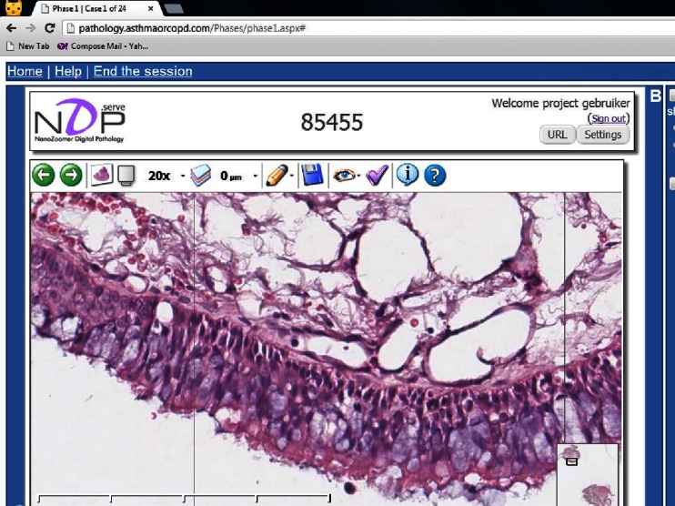 Older asthmatic patients may develop fixed airway obstruction and clinical signs of chronic obstructive pulmonary disease (COPD). We investigated the added value of pathological evaluation of bronchial biopsies to help differentiate asthma from COPD, taking into account smoking, age, and inhaled corticosteroid (ICS) use. Asthma and COPD patients (24 of each category) were matched for ICS use, age, FEV(1), and smoking habits. Five pulmonary and five general pathologists examined bronchial biopsies using an interactive website, without knowing patient information. They were asked to diagnose asthma or COPD on biopsy findings in both a pairwise and randomly mixed order of cases during four different phases, with intervals of 4-6 weeks, covering a maximal period of 36 weeks. Clinically concordant diagnoses of asthma or COPD varied between 63 %-73 %, without important differences between pairwise vs randomly mixed examination or between general vs pulmonary pathologists. The highest percentage of concordant diagnoses was in young asthmatic patients without ICS use and in COPD patients with ICS use. In non ICS users with fixed airway obstruction, a COPD diagnosis was favored if abnormal presence of glands, squamous metaplasia, and submucosal infiltrate was present and an asthma diagnosis in case of abnormal presence of goblet cells. In ICS users with fixed airway obstruction, abnormal presence of submucosal infiltrates, basement membrane thickening, eosinophils, and glands was associated with asthma. Histological characteristics in bronchial biopsies are reproducibly recognized by pathologists, yet the differentiation by histopathology between asthma and COPD is difficult without information about ICS use.