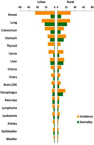 Results: The estimates of new cancer incident cases and cancer deaths were 3,372,175 and 2,113,048 in 2011, respectively. The crude incidence was 250.28/1,00,000 (277.77/1,00,000 for males and 221.37/1,00,000 for females). The ASRs of incidence by the Chinese standard population (ASRIC) and by the world standard population (ASRIW) were 186.34/1,00,000 and 182.76/1,00,000, respectively, with a cumulative incidence (0-74 years old) of 21.20%. Cancers of the lung, female breast, stomach, liver, colorectum, esophagus, cervix, uterus, prostate, and ovary were the most common cancers, accounting for approximately 75% of all new cancer cases. Lung, liver, gastric, esophageal, colorectal, female breast, pancreatic, brain, and cervical cancers and leukemia were the leading causes of cancer death, accounting for approximately 80% of all cancer deaths. Cancer incidence, mortality, and spectrum were all different between urban and rural areas and between males and females.