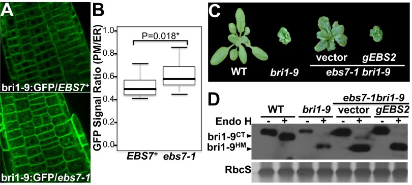 Endoplasmic reticulum (ER)-associated degradation (ERAD) is an essential part of an ER-localized protein quality-control system for eliminating terminally misfolded proteins. Recent studies have demonstrated that the ERAD machinery is conserved among yeast, animals, and plants; however, it remains unknown if the plant ERAD system involves plant-specific components. Here we report that the Arabidopsis ethyl methanesulfonate-mutagenized brassinosteroid-insensitive 1 suppressor 7 (EBS7) gene encodes an ER membrane-localized ERAD component that is highly conserved in land plants. Loss-of-function ebs7 mutations prevent ERAD of brassinosteroid insensitive 1-9 (bri1-9) and bri1-5, two ER-retained mutant variants of the cell-surface receptor for brassinosteroids (BRs). As a result, the two mutant receptors accumulate in the ER and consequently leak to the plasma membrane, resulting in the restoration of BR sensitivity and phenotypic suppression of the bri1-9 and bri1-5 mutants. EBS7 accumulates under ER stress, and its mutations lead to hypersensitivity to ER and salt stresses. EBS7 interacts with the ER membrane-anchored ubiquitin ligase Arabidopsis thaliana HMG-CoA reductase degradation 1a (AtHrd1a), one of the central components of the Arabidopsis ERAD machinery, and an ebs7 mutation destabilizes AtHrd1a to reduce polyubiquitination of bri1-9. Taken together, our results uncover a plant-specific component of a plant ERAD pathway and also suggest its likely biochemical function.