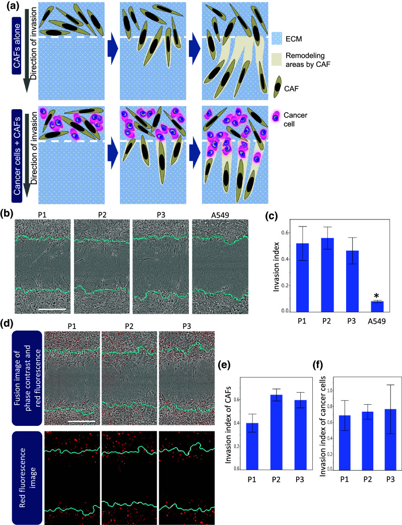 Purpose: As one form of tumor invasion, cancer cells can invade the extracellular matrix (ECM) through tracks that have been physically remodeled by cancer-associated fibroblasts (CAFs). However, CAFs are a heterogeneous population with diverse matrix-remodeling capacities. The purpose of this study was to investigate how CAFs with various matrix-remodeling capacities influence cancer cell invasion.