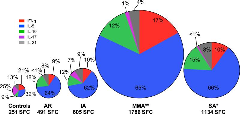 Methods: Proteomic and transcriptomic techniques were used to identify novel antigens recognized by allergen-specific T cells. To characterize different TH functionalities of allergen-specific T cells, ELISPOT assays with sets of overlapping peptides covering the sequences of known allergens and novel antigens were employed to measure release of IL-5, IFNγ, IL-10, IL-17 and IL-21.