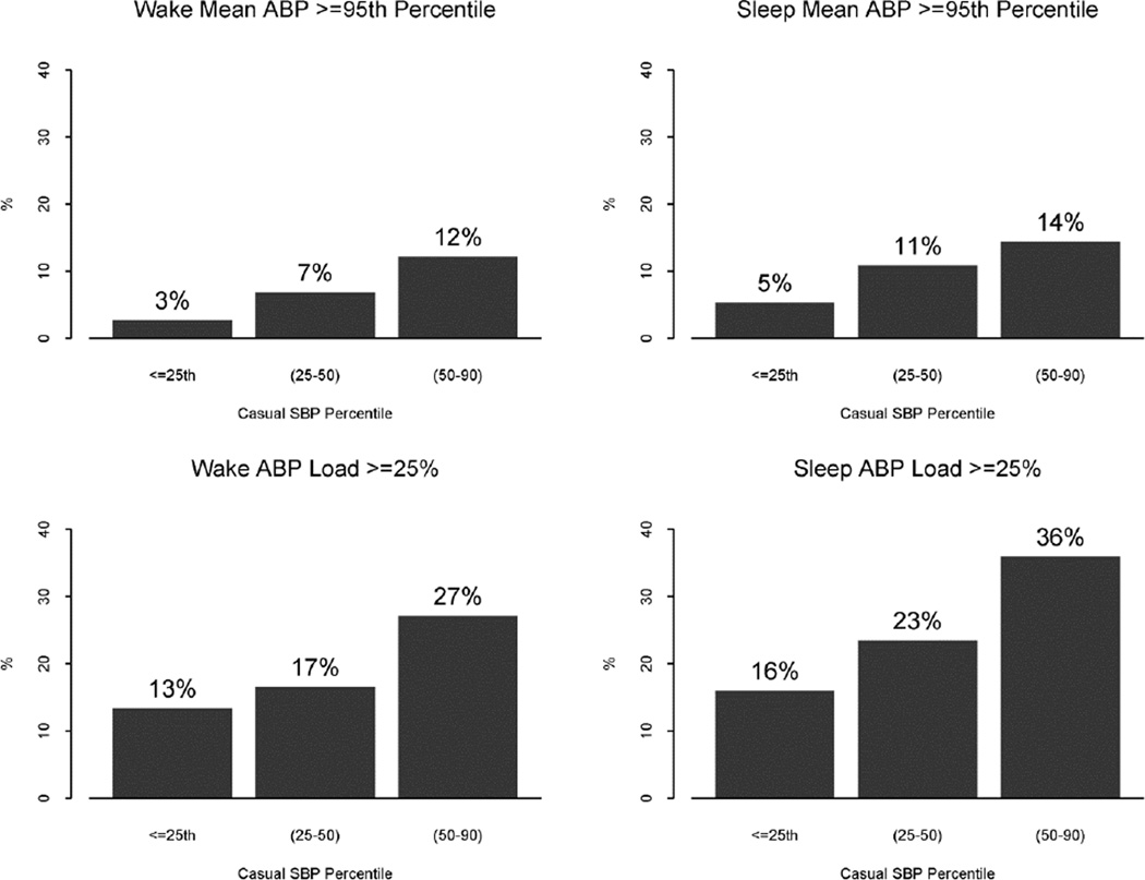 Methods/results: We hypothesized that lower levels of normal casual BP are associated with a lower prevalence of masked hypertension. Data from the chronic kidney disease (CKiD) cohort were analyzed cross-sectionally across multiple visits. The majority of children with normal casual BP also had normal wake and sleep ABP (60 %), even at the highest percentiles of casual BP. The frequency of masked hypertension was lower in children with casual BP ≤25th percentile versus those with casual BP in 26-50th percentile and casual BP in 51-90th percentile during both wake and sleep periods. In children with the lowest normal casual BP levels (≤25th percentile), the frequency of abnormal mean wake or sleep ABP was 2-7 %, and of abnormal BP load was 6-16 %.