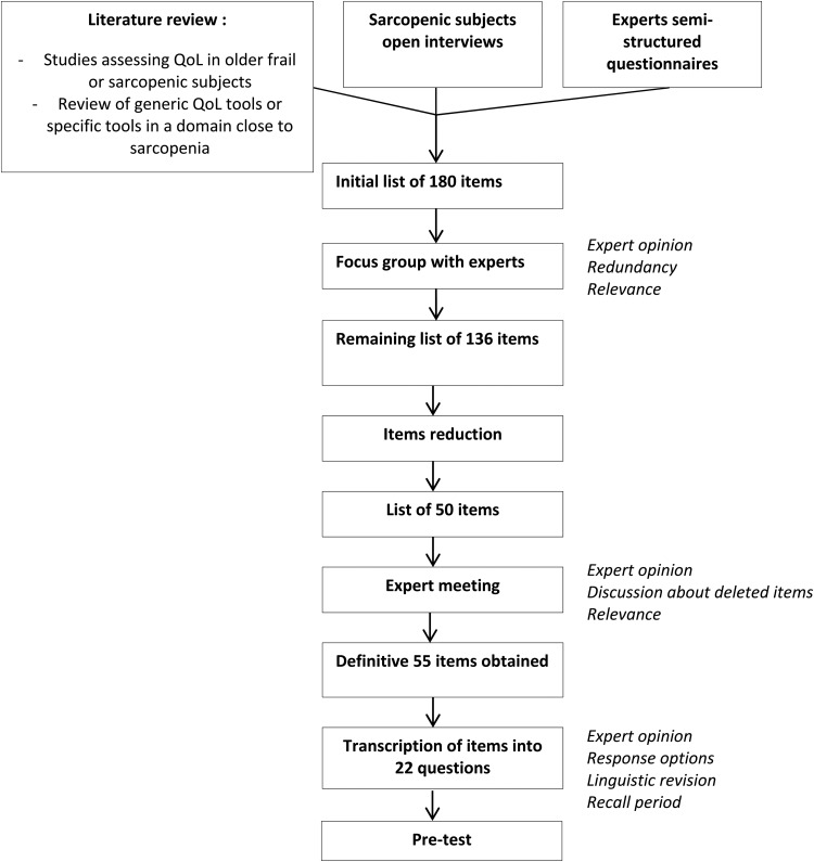 Methods: The study was articulated in the following four stages: (i) Item generation-based on literature review, sarcopenic subjects' opinion, experts' opinion, focus groups; (ii) Item reduction-based on sarcopenic subjects' and experts' preferences; (iii) Questionnaire generation-developed during an expert meeting; (iv) Pretest of the questionnaire-based on sarcopenic subjects' opinion.