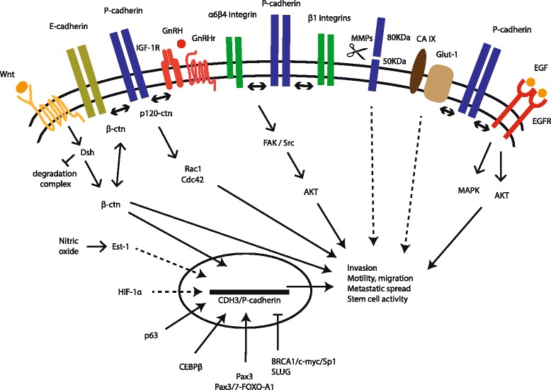 P-cadherin is a classical cell-to-cell adhesion molecule with a homeostatic function in several normal tissues. However, its behaviour in the malignant setting is notably dependent on the cellular context. In some tumour models, such as melanoma and oral squamous cell carcinoma, P-cadherin acts as a tumour suppressor, since its absence is associated with a more aggressive cancer cell phenotype; nevertheless, the overexpression of this molecule is linked to significant tumour promoting effects in the breast, ovarian, prostate, endometrial, skin, gastric, pancreas and colon neoplasms. Herein, we review the role of P-cadherin in cancer cell invasion, as well as in loco-regional and distant metastatic dissemination. We focus in P-cadherin signalling pathways that are activated to induce invasion and metastasis, as well as cancer stem cell properties. The signalling network downstream of P-cadherin is notably dependent on the cellular and tissue context and includes the activation of integrin molecules, receptor tyrosine kinases, small molecule GTPases, EMT transcription factors, and crosstalk with other cadherin family members. As new oncogenic molecular pathways mediated by P-cadherin are uncovered, putative therapeutic options can be tested, which will allow for the targeting of invasion or metastatic disease, depending on the tumour model.