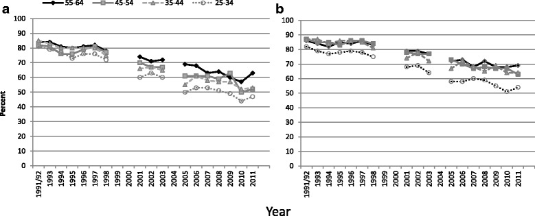 Results: All surveys covered residents not just citizens; three countries excluded those in institutions. In two surveys, physical examinations and blood sample collection were conducted at the participants' home; the others occurred at examination clinics. Recruitment processes varied considerably between surveys. Monetary incentives were used in four surveys. Initial participation rates aged 35-64 were 45% in the Netherlands (phase II), 54% in Germany (new and previous participants combined), 55% in Italy, and 65% in Finland. In Ireland, England and Scotland, household participation rates were 66%, 66% and 63% respectively. Participation rates were generally higher in women and increased with age. Almost all participants attending an examination centre agreed to all modules but surveys conducted in the participants' home had falling responses to each stage. Participation rates in most primate cities were substantially lower than the national average. Age-standardized response rates to blood pressure measurement among those aged 35-64 in Finland, Germany and England fell by 0.7-1.5 percentage points p.a. between 1998-2002 and 2010-2012. Longer trends in some countries show a more marked fall.
