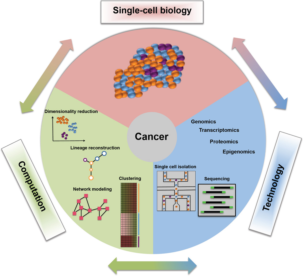 Genetic changes and environmental differences result in cellular heterogeneity among cancer cells within the same tumor, thereby complicating treatment outcomes. Recent advances in single-cell technologies have opened new avenues to characterize the intra-tumor cellular heterogeneity, identify rare cell types, measure mutation rates, and, ultimately, guide diagnosis and treatment. In this paper we review the recent single-cell technological and computational advances at the genomic, transcriptomic, and proteomic levels, and discuss their applications in cancer research.