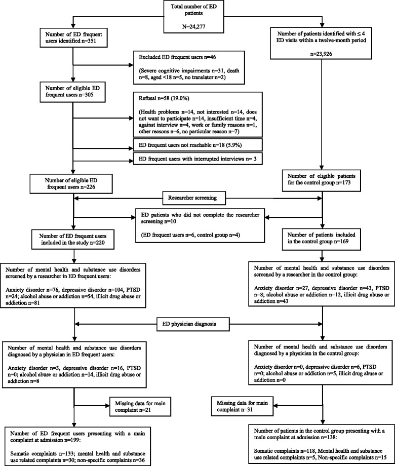 Methods: This study is a cross-sectional study with concurrent and retrospective data collection. Between November 2009 and June 2010, patients' mental health and substance use disorders were identified prospectively in face-to-face research interviews using a screening questionnaire (i.e. researcher screening). These data were compared to the data obtained from a retrospective medical chart review performed in August 2011, searching for mental health and substance use disorders diagnosed by ED physicians and recorded in the patients' ED medical files (i.e. ED physician diagnosis). The sample consisted of 399 eligible adult patients (≥18 years old) admitted to the urban, general ED of a University Hospital. Among them, 389 patients completed the researcher screening. Two hundred and twenty frequent users defined by >4 ED visits in the previous twelve months were included and compared to 169 patients with ≤4 ED visits in the same period (control group).
