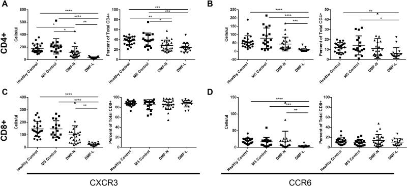 Results: Lymphopenic DMF-treated patients had significantly fewer circulating CD8(+) and CD4(+) T cells, CD56(dim) natural killer (NK) cells, CD19(+) B cells and plasmacytoid dendritic cells when compared to controls. CXCR3(+) and CCR6(+) expression was disproportionately reduced among CD4(+) T cells, while the proportion of T-regulatory (T-reg) cells was unchanged. DMF did not affect circulating CD56(hi) NKcells, monocytes or myeloid dendritic cells. Whether lymphopenic or not, DMF-treated patients had a lower proportion of circulating central and effector memory T cells and concomitant expansion of naïve T cells compared to the controls.