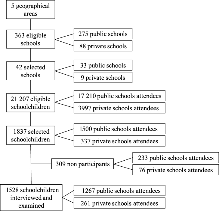 Results: The prevalence of dental erosion was 15% [95% confidence interval (95% CI): 13.6-16.5], being mainly mild erosion. Boys [odds ratio (OR) = 1.57, 95% CI: 1.17-2.10], private school attendees (OR = 1.45, 95% CI: 1.01-2.06) and schoolchildren reporting the daily consumption of soft drinks (OR = 5.04, 95% CI: 1.17-21.71) were more likely to have at least one tooth with dental erosion. Gender [boys, rate ratio (RR) = 1.66, 95% CI: 1.28-2.17], type of school (private, RR = 1.89, 95% CI: 1.53-2.35), the consumption of soft drinks (sometimes: RR = 5.27, 95% CI: 1.46-19.05; daily: RR = 6.82, 95% CI: 1.39-33.50) and the daily consumption of lemon (RR = 1.49, 95% CI: 1.11-2.00) were significantly associated with the number of affected surfaces.