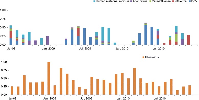 Methods: During 2008-2010, we conducted a prospective cohort study and followed ~1,800 Argentinian children aged ≤5 years to identify those children who were hospitalized or who sought care at an emergency room with any acute respiratory infection sign or symptom (e.g., rhinorrhea, cough, wheezing, tachypnea, retractions, or cyanosis). Respiratory samples were obtained for respiratory syncytial virus, influenza, parainfluenza, adenovirus, and metapneumovirus testing by immunofluorescence and for rhinovirus by real-time reverse transcription polymerase chain reaction.