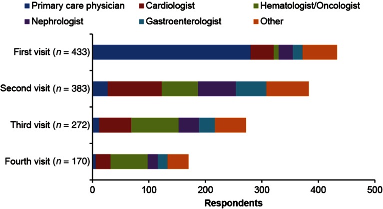 Results: The initial survey was completed by 533 participants (follow-up survey completed by 201 participants). AL amyloidosis was the most common diagnosis. For 37.1% of respondents, the diagnosis of amyloidosis was not established until ≥ 1 year after the onset of initial symptoms. Diagnosis was received after visits to 1, 2, 3, 4, or ≥ 5 physicians by 7.6%, 23.5%, 20.3%, 16.8%, and 31.8% of respondents, respectively. Correct diagnosis was most often made by hematologists/oncologists (34.1%). Treatments included chemotherapy (63.1%) and stem cell transplantation (38.9%) and were difficult to tolerate for 54.1% of respondents. A significant number of respondents felt uninformed about clinical trials. Nevertheless, approximately half (46.1%) believed that enrolling in a trial would enhance their care.