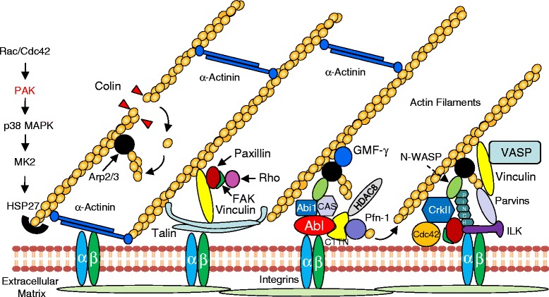 Asthma is characterized by airway hyperresponsiveness and airway remodeling, which are largely attributed to increased airway smooth muscle contractility and cell proliferation. It is known that both chemical and mechanical stimulation regulates smooth muscle contraction. Recent studies suggest that contractile activation and mechanical stretch induce actin cytoskeletal remodeling in smooth muscle. However, the mechanisms that control actin cytoskeletal reorganization are not completely elucidated. This review summarizes our current understanding regarding how actin-associated proteins may regulate remodeling of the actin cytoskeleton in airway smooth muscle. In particular, there is accumulating evidence to suggest that Abelson tyrosine kinase (Abl) plays a critical role in regulating airway smooth muscle contraction and cell proliferation in vitro, and airway hyperresponsiveness and remodeling in vivo. These studies indicate that Abl may be a novel target for the development of new therapy to treat asthma.