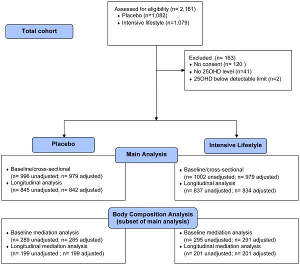 Methods: The study was conducted in the placebo (n = 1082) and intensive lifestyle (n = 1079) groups of the Diabetes Prevention Program (DPP), a multicenter trial to prevent type 2 diabetes in adults with prediabetes. Weight and 25OHD were measured at baseline, month 6, years 1 and 2. In a subset (n = 584), visceral (VAT) and subcutaneous (SAT) adiposity were assessed by computed tomography at baseline and year 1.