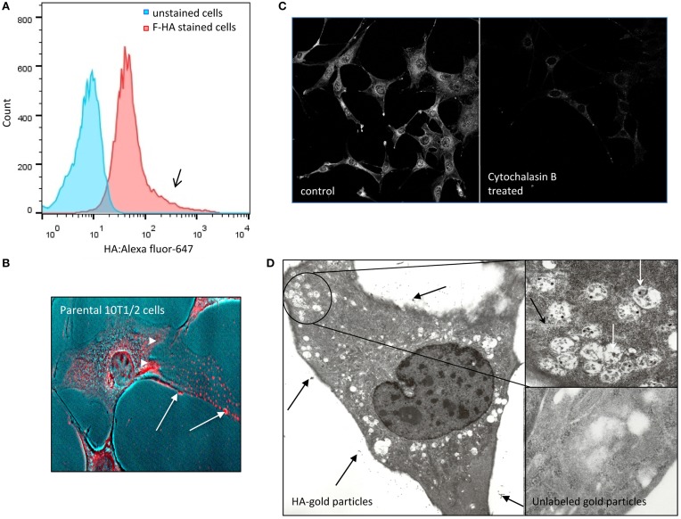 The interaction of hyaluronan (HA) with mesenchymal progenitor cells impacts trafficking and fate after tissue colonization during wound repair and these events contribute to diseases such as cancer. How this interaction occurs is poorly understood. Using 10T½ cells as a mesenchymal progenitor model and fluorescent (F-HA) or gold-labeled HA (G-HA) polymers, we studied the role of two HA receptors, RHAMM and CD44, in HA binding and uptake in non-adherent and adherent mesenchymal progenitor (10T½) cells to mimic aspects of cell trafficking and tissue colonization. We show that fluorescent labeled HA (F-HA) binding/uptake was high in non-adherent cells but dropped over time as cells became increasingly adherent. Non-adherent cells displayed both CD44 and RHAMM but only function-blocking anti-RHAMM and not anti-CD44 antibodies significantly reduced F-HA binding/uptake. Adherent cells, which also expressed CD44 and RHAMM, primarily utilized CD44 to bind to F-HA since anti-CD44 but not anti-RHAMM antibodies blocked F-HA uptake. RHAMM overexpression in adherent 10T½ cells led to increased F-HA uptake but this increased binding remained CD44 dependent. Further studies showed that RHAMM-transfection increased CD44 mRNA and protein expression while blocking RHAMM function reduced expression. Collectively, these results suggest that cellular microenvironments in which these receptors function as HA binding proteins differ significantly, and that RHAMM plays at least two roles in F-HA binding by acting as an HA receptor in non-attached cells and by regulating CD44 expression and display in attached cells. Our findings demonstrate adhesion-dependent mechanisms governing HA binding/ uptake that may impact development of new mesenchymal cell-based therapies.