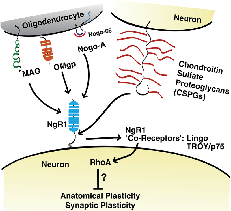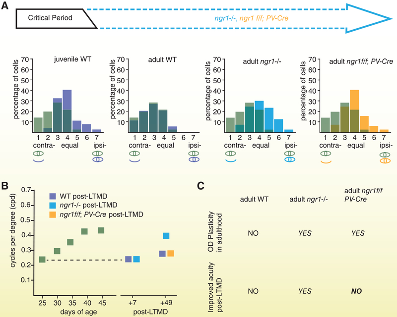 During the developmental critical period for visual plasticity, discordant vision alters the responsiveness of neurons in visual cortex. The subsequent closure of the critical period not only consolidates neural function but also limits recovery of acuity from preceding abnormal visual experience. Despite species-specific differences in circuitry of the visual system, these characteristics are conserved. The nogo-66 receptor 1 (ngr1) is one of only a small number of genes identified thus far that is essential to closing the critical period. Mice lacking a functional ngr1 gene retain developmental visual plasticity as adults and their visual acuity spontaneously improves after prolonged visual deprivation. Experiments employing conditional mouse genetics have revealed that ngr1 restricts plasticity within distinct circuits for ocular dominance and visual acuity. However, the mechanisms by which NgR1 limits plasticity have not been elucidated, in part because the subcellular localization and signal transduction of the protein are only partially understood. Here we explore potential mechanisms for NgR1 function in relation to manipulations that reactivate visual plasticity in adults and propose lines of investigation to address relevant gaps in knowledge.