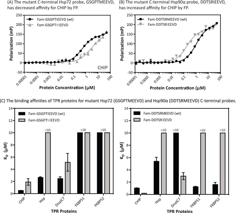 Heat shock protein 70 (Hsp70) and heat shock protein 90 (Hsp90) require the help of tetratricopeptide repeat (TPR) domain-containing cochaperones for many of their functions. Each monomer of Hsp70 or Hsp90 can interact with only a single TPR cochaperone at a time, and each member of the TPR cochaperone family brings distinct functions to the complex. Thus, competition for TPR binding sites on Hsp70 and Hsp90 appears to shape chaperone activity. Recent structural and biophysical efforts have improved our understanding of chaperone-TPR contacts, focusing on the C-terminal EEVD motif that is present in both chaperones. To better understand these important protein-protein interactions on a wider scale, we measured the affinity of five TPR cochaperones, CHIP, Hop, DnaJC7, FKBP51, and FKBP52, for the C-termini of four members of the chaperone family, Hsc70, Hsp72, Hsp90α, and Hsp90β, in vitro. These studies identified some surprising selectivity among the chaperone-TPR pairs, including the selective binding of FKBP51/52 to Hsp90α/β. These results also revealed that other TPR cochaperones are only able to weakly discriminate between the chaperones or between their paralogs. We also explored whether mimicking phosphorylation of serine and threonine residues near the EEVD motif might impact affinity and found that pseudophosphorylation had selective effects on binding to CHIP but not other cochaperones. Together, these findings suggest that both intrinsic affinity and post-translational modifications tune the interactions between the Hsp70 and Hsp90 proteins and the TPR cochaperones.