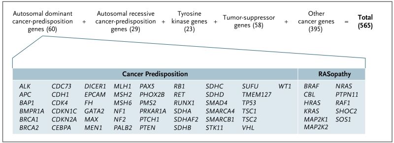 Conclusions: Germline mutations in cancer-predisposing genes were identified in 8.5% of the children and adolescents with cancer. Family history did not predict the presence of an underlying predisposition syndrome in most patients. (Funded by the American Lebanese Syrian Associated Charities and the National Cancer Institute.).