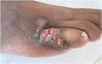Case presentation: In this paper, we report the clinical presentations, treatments and outcomes of five cases of invasive Neoscytalidium infections with cutaneous involvement, including two cases with disseminated infection, in five renal transplant recipients. To our knowledge, this is the first report of a series-albeit small-of renal transplant patients in whom this infection was identified. All cases occurred in a single hospital in Paris, France, between 2001 and 2011. Patients all originate from tropical area.