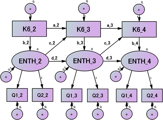 Methods: Working people with subthreshold depression were recruited to participate in the telephone CBT (tCBT) program with demonstrated effectiveness. Their enthusiasm for homework was enhanced with motivational interviewing techniques and was measured by asking two questions: "How strongly do you feel you want to do this homework?" and "How confident do you feel you can actually accomplish this homework?" at the end of each session. The outcome was the K6 score, which was administered at the start of each session. The K6 is an index of psychological distress including depression and anxiety. We used structural equation modeling (SEM) to elucidate the relationships between enthusiasm and the K6 scores from session to session.