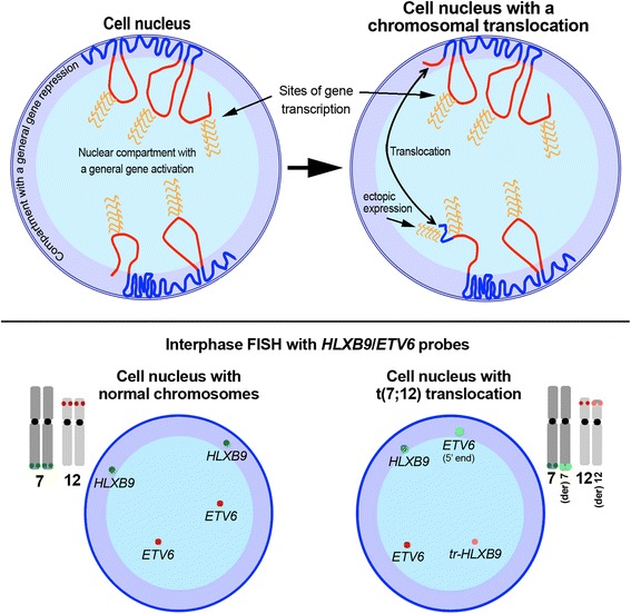 The presence of chromosomal abnormalities is one of the most important criteria for leukaemia diagnosis and management. Infant leukaemia is a rare disease that affects children in their first year of life. It has been estimated that approximately one third of infants with acute myeloid leukaemia harbour the t(7;12)(q36;p13) rearrangement in their leukaemic blasts. However, the WHO classification of acute myeloid leukaemia does not yet include the t(7;12) as a separate entity among the different genetic subtypes, although the presence of this chromosomal abnormality has been associated with an extremely poor clinical outcome. Currently, there is no consensus treatment for t(7;12) leukaemia patients. However, with the inferior outcome with the standard induction therapy, stem cell transplantation may offer a better chance for disease control. A better insight into the chromosome biology of this entity might shed some light into the pathogenic mechanisms arising from this chromosomal translocation, that at present are not fully understood. Further work is needed to improve our understanding of the molecular and genetic basis of this disorder. This will hopefully open some grounds for possible tailored treatment for this subset of very young patients with inferior disease outcome. This review aims at highlighting the cytogenetic features that characterise the t(7;12) leukaemias for a better detection of the abnormality in the diagnostic setting. We also review treatment and clinical outcome in the cases reported to date.