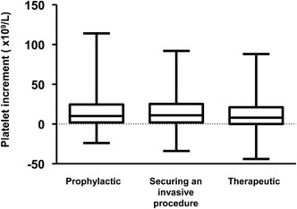 Results: 296 patients were included and received a total of 904 platelet transfusions, for prophylactic indications in 300 (33.2 %) episodes, for securing an invasive procedure in 257 (28.4 %), and for treatment of minor to major bleeding manifestations in 347 (38.4 %). Most prophylactic transfusions (80 %) were performed at platelet count thresholds below 10-20 × 10(9)/L. Platelet increments were generally low in all three indications, 10 (interquartile range 2-25), 11 (2-25), and 8 (0-21) × 10(9)/L, respectively. A total of 97 major ICU-acquired bleeding events occurred in 40 patients. About half of those bleeding episodes (54.7 %) occurred at platelet counts below 20 × 10(9)/L. However, neither low admission platelet count nor low nadir platelet counts were predictive of ICU-acquired bleeding. The in-ICU mortality rate tended to be higher in patients with severe ICU-acquired bleeding events (50 vs. 36 %).